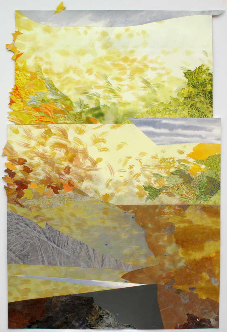 Flux (Windy) 2026 mixed media relief and collage: woodcut, relief print, collograph, acrylic ink and paint, colored pencil approx. 56" x 37" x 1/4" (shaped piece)
